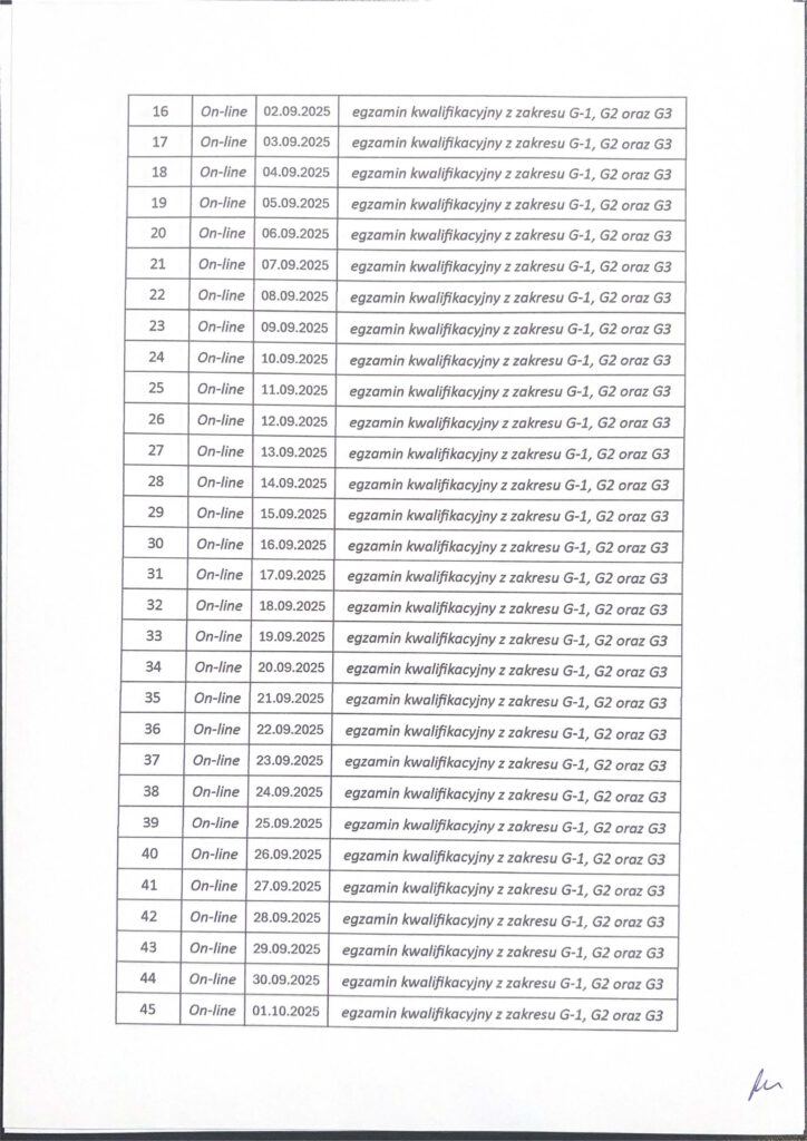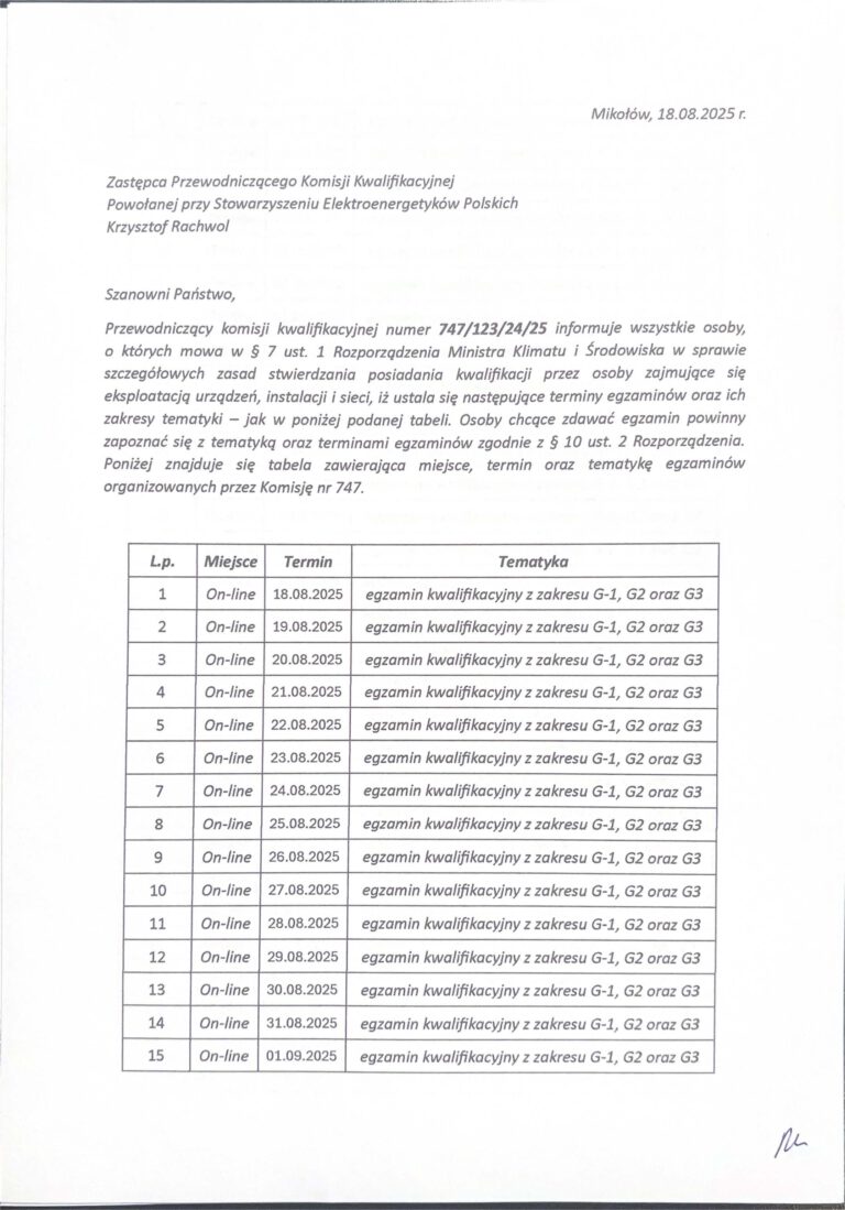 Przewodniczący komisji kwalifikacyjnej numer 747/123/24/25 informuje wszystkie osoby o których mowa w § 7 ust 1 Rozporządzenia Ministra Klimatu i Środowiska w sprawie szczegółowych zasad stwierdzania posiadania kwalifikacji przez osoby zajmujące się eksploatacją urządzeń, instalacji i sieci, iż ustala się następujące terminy egzaminów oraz ich zakresy tematyki – jak w poniżej podanej tabeli. Osoby chcące zdawać egzamin powinny zapoznać się z tematyką oraz terminami egzaminów zgodnie z § 10 ust. 2 Rozporządzenia.