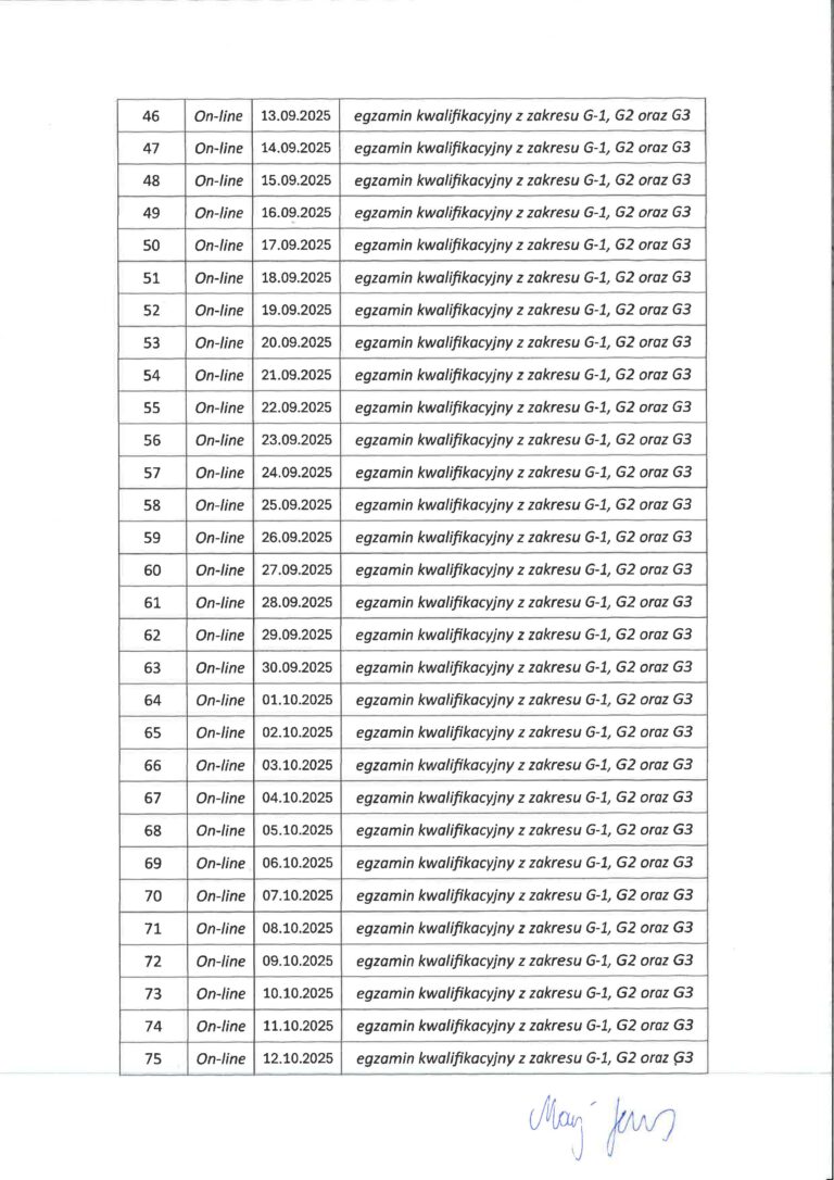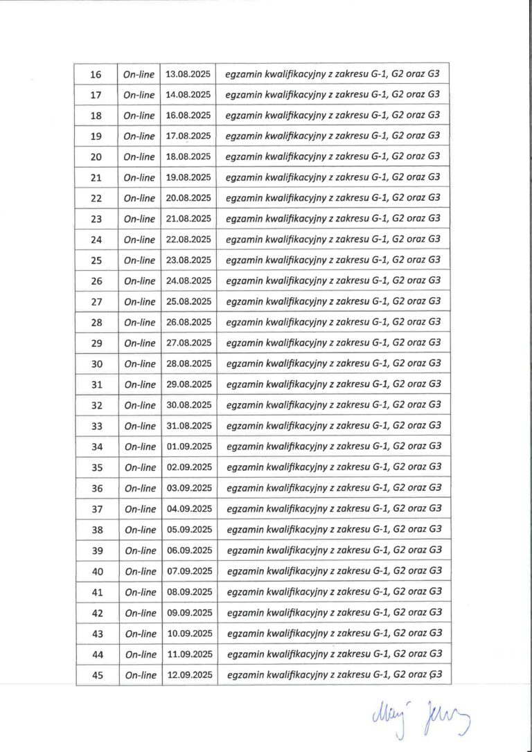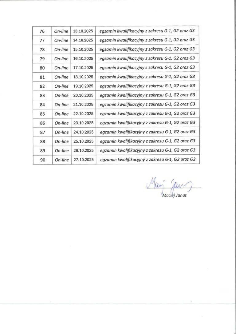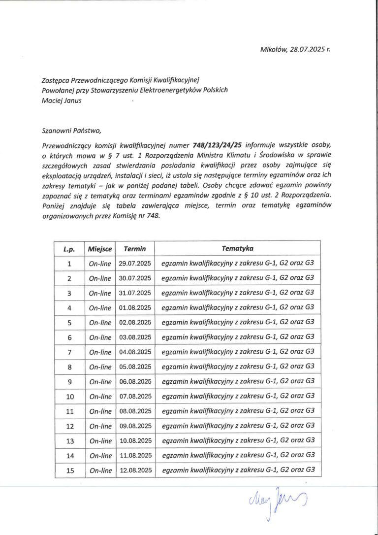 Przewodniczący komisji kwalifikacyjnej numer 748/123/24/25 informuje wszystkie osoby o których mowa w § 7 ust 1 Rozporządzenia Ministra Klimatu i Środowiska w sprawie szczegółowych zasad stwierdzania posiadania kwalifikacji przez osoby zajmujące się eksploatacją urządzeń, instalacji i sieci, iż ustala się następujące terminy egzaminów oraz ich zakresy tematyki – jak w poniżej podanej tabeli. Osoby chcące zdawać egzamin powinny zapoznać się z tematyką oraz terminami egzaminów zgodnie z § 10 ust. 2 Rozporządzenia.